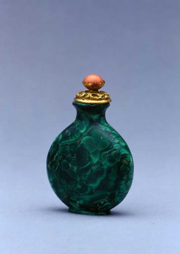 不仅在西方,在古代中国,孔雀石是极为珍贵的美玉,非皇亲国戚基本与它无缘。现藏于故宫博物院的这个孔雀石鼻烟壶,更是极为难得的珍品。其通体的花纹不密也不疏,深深浅浅的绿色有浓妆亦有淡抹,又奇又妙。