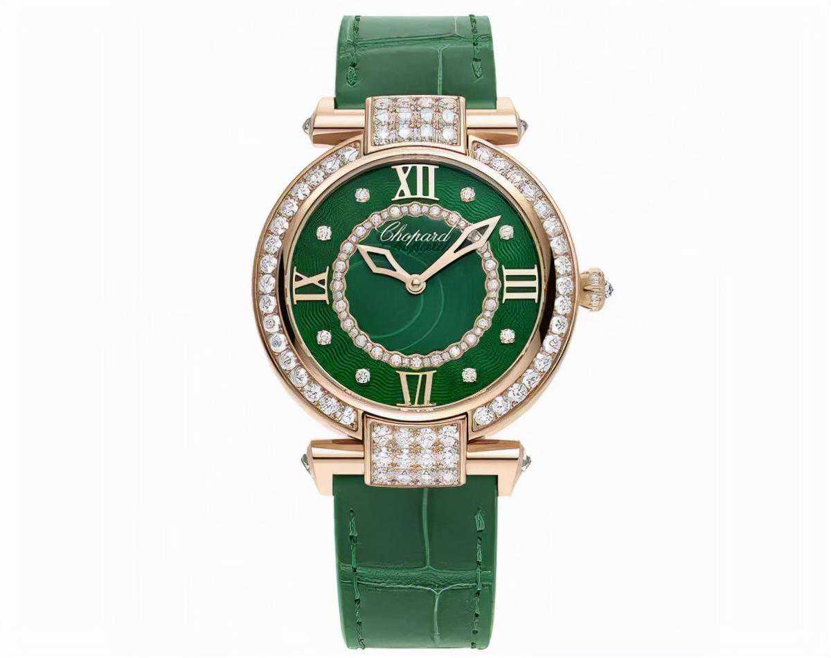 孔雀石还能放在表盘上,腕表表盘可以最大程度的展示孔雀石独特的天然花纹。这枚腕表的金绿配色不仅高级还显白呢~~
