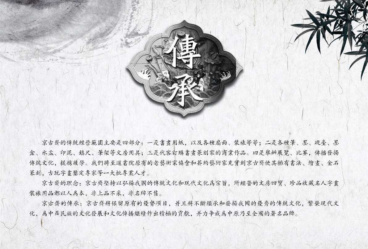 京古斋是中华老字号,历史悠久,在文化传承的道路上,任重道远。不积跬步无以至千里,不积小流无以成江海。今日京古斋将始终恪守“非上品不采,非真品不进,非名牌不售,非名家不藏”的原则,坚持诚信、务实、融通、创新的作风,努力搭建艺术家与市场之间的桥梁,为艺术品市场注入新的活力与希望。努力以开封为起点,为河南省乃至全国的艺术文化事业做出贡献。