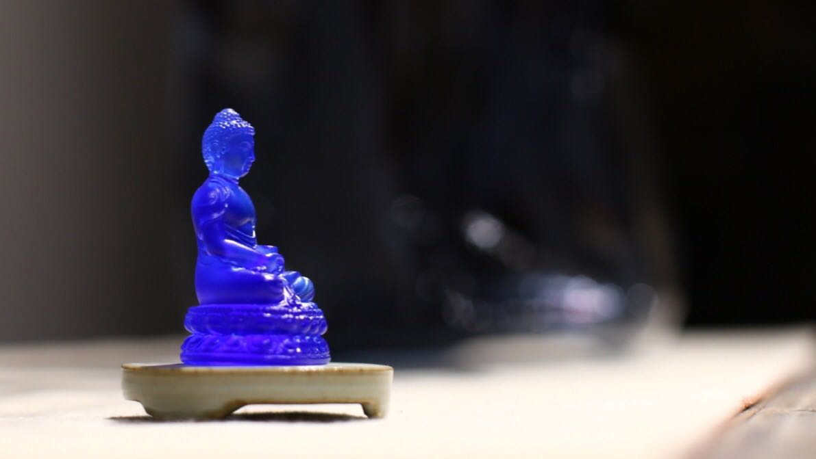 “逸舍”陈列牧之的琉璃藏品:古铜色狮耳炉、宝蓝琉璃药师寸佛、战国蜻蜓眼老琉璃珠、高古水晶珠……牧之发自内心地热爱琉璃,对于他来说,“藏品”不是被束之高阁的高冷玩物,而是生活中朝夕相处的亲切伴随。