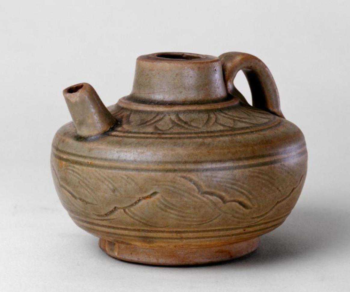 金代耀州窑青釉刻水波菊瓣纹小执壶