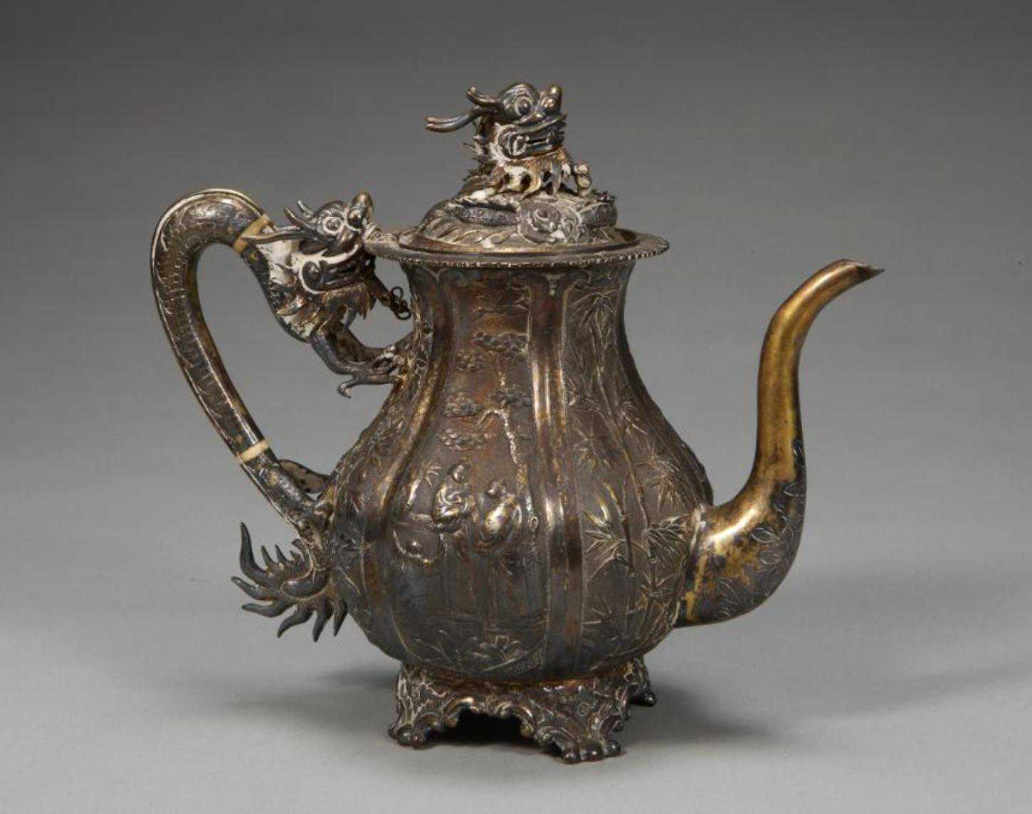 清代银梅竹人物图龙柄带盖执壶