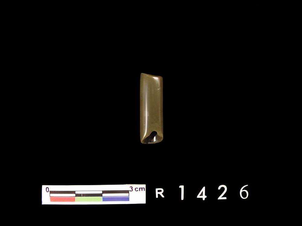 半圆形,一端残缺,一端有一小缺口,质极硬,色青绿