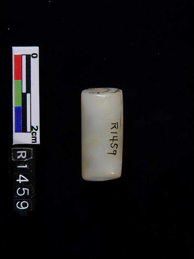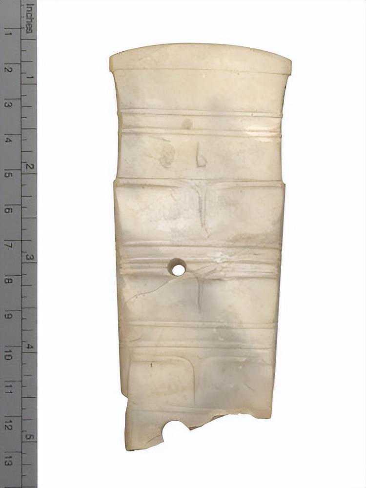 器为弧状,两端有孔,外面刻有带目文之纹饰两组,色白,微有斑。