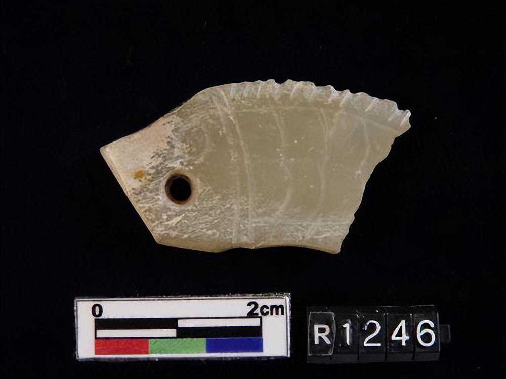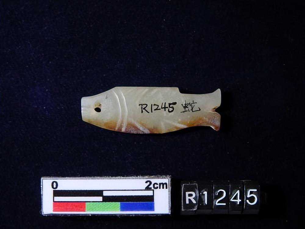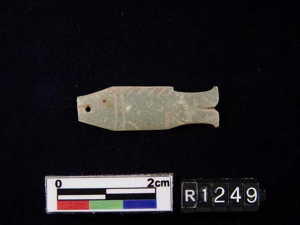 1443墓。。。玉鱼璜,目為一小孔,背腹鰭均為細小之刻文,尾薄如刀刃。。。