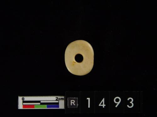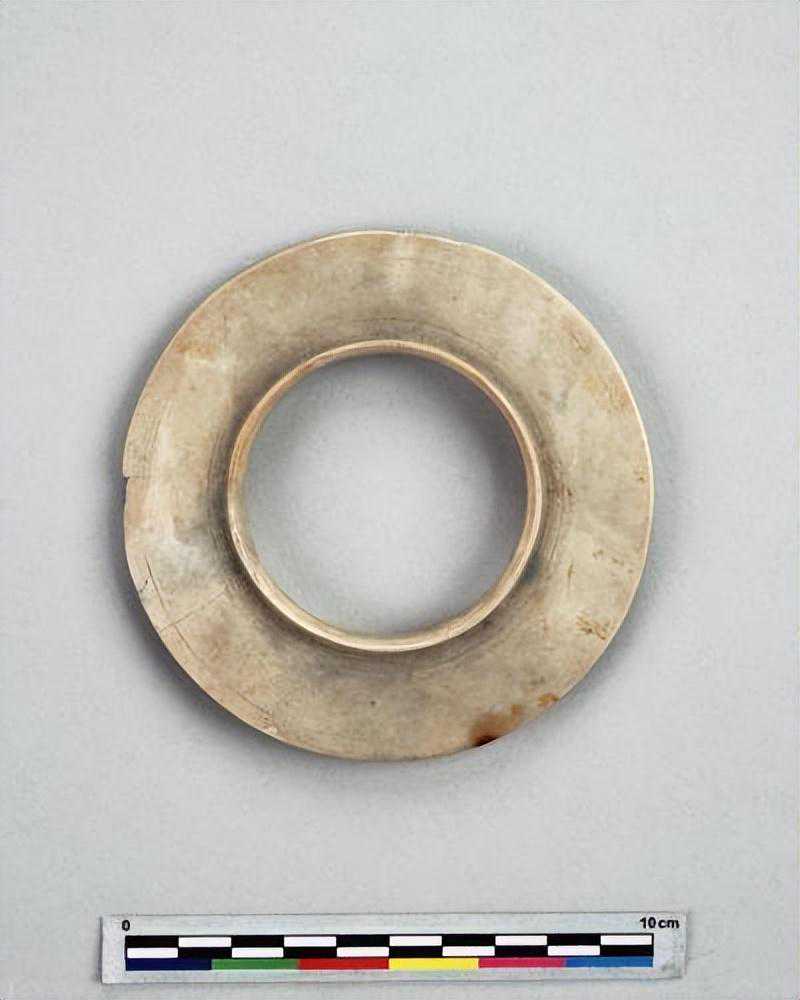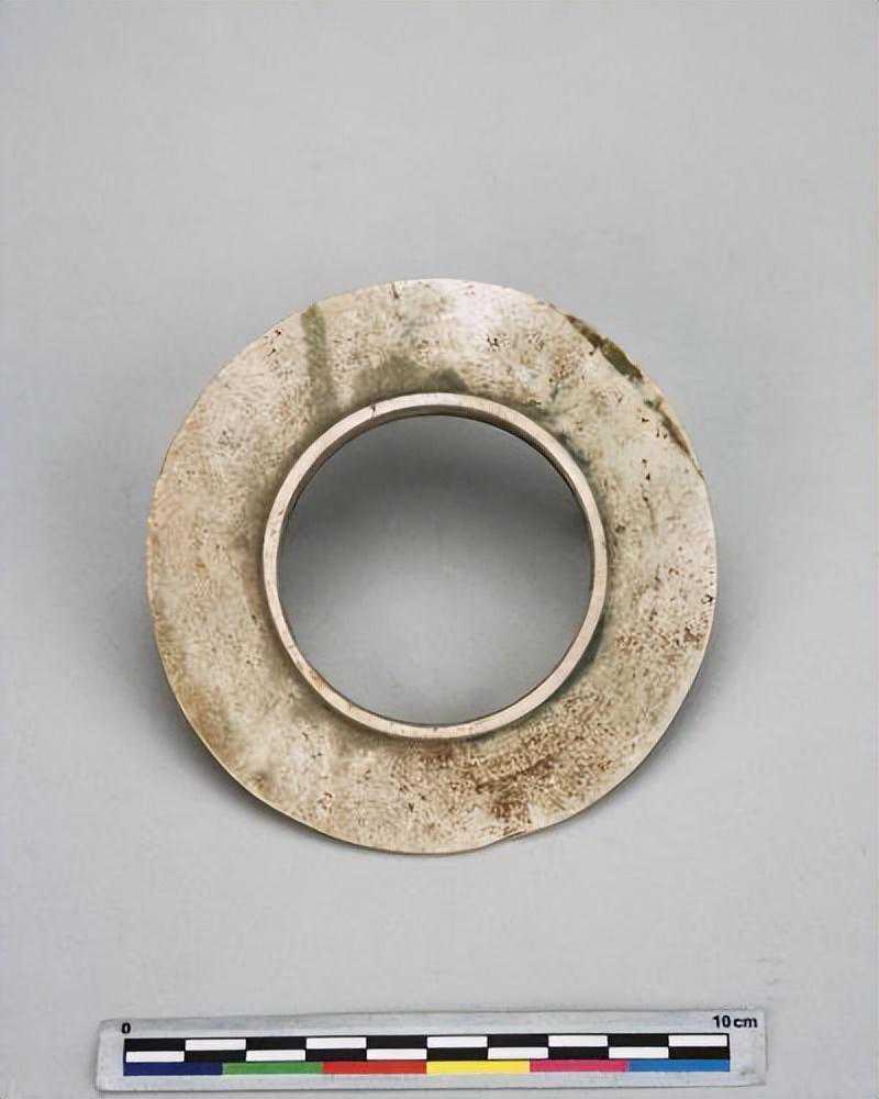 色灰白,杂绿斑,形式同1550-40墓里出的玉凸边璧(R00912)。