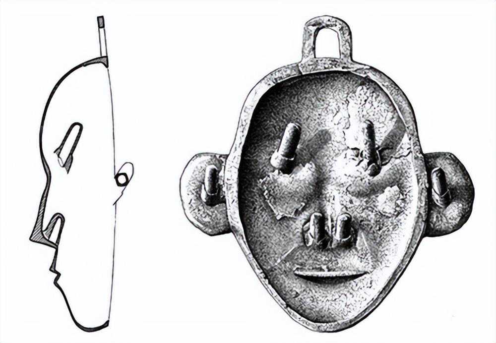 为一平面雕刻,背凹而面略凸,头上两角属曲,两旁有两小耳,双目圆睁鼻大,下为一槽,形极狞恶,色白,有涂硃痕。