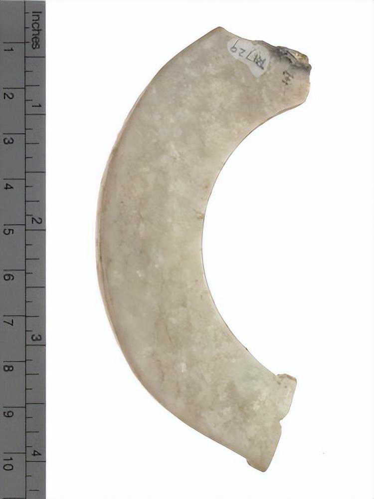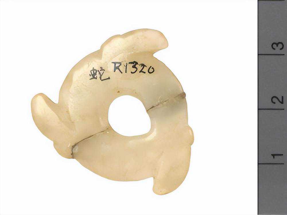 为蟠龙之侧面,口为一长槽,中为一穿,两者相连而实不连,色淡白。