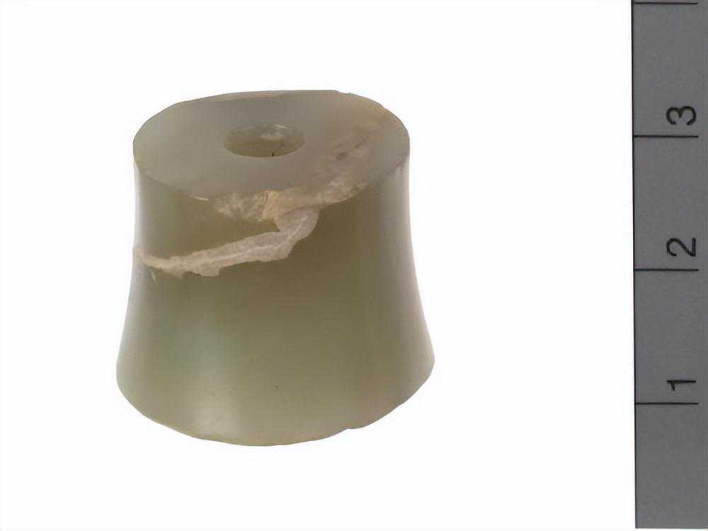 此件玉器出于石磬的上面,深灰绿色,顶端钮形,下接一细腰形茎,有二周弦纹,形体细小,可能是击磬所用木棒的柄部。色暗绿。。。玉质很不错。。。