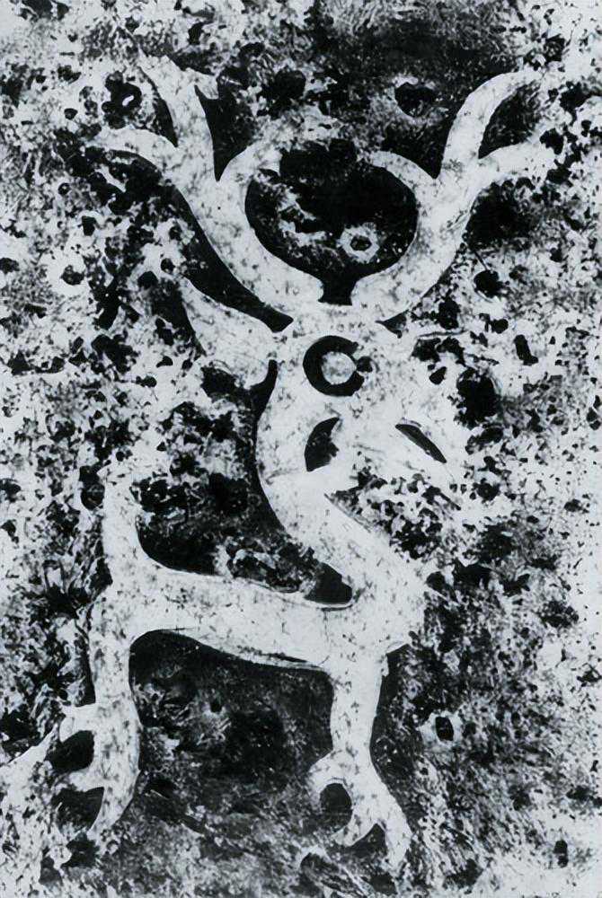 为一面平面,石片上浮出一兽头,兽之两角高耸,下为两眼,石片上下有穿孔,并有涂珠之刻文,惜残缺,不知其全形,色黄。