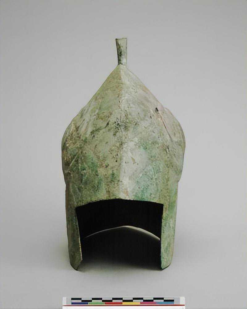 顶端略尖,盔身成圆筒状,顶中有一圆管是插羽毛用。。。前有长方形缺口,正面饰双捲角兽面纹,无眉,双眼和鼻端圆突,两侧有圆涡纹,纹饰中有一孔,遍体绿锈,底部残破.