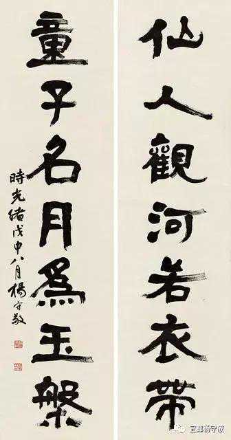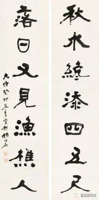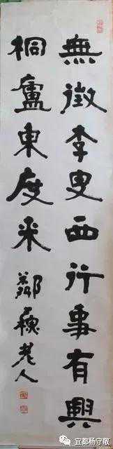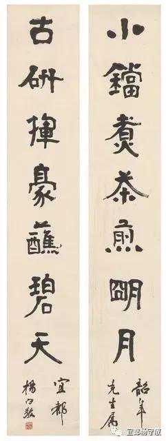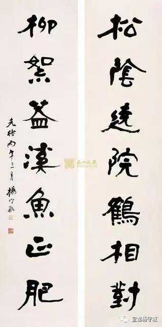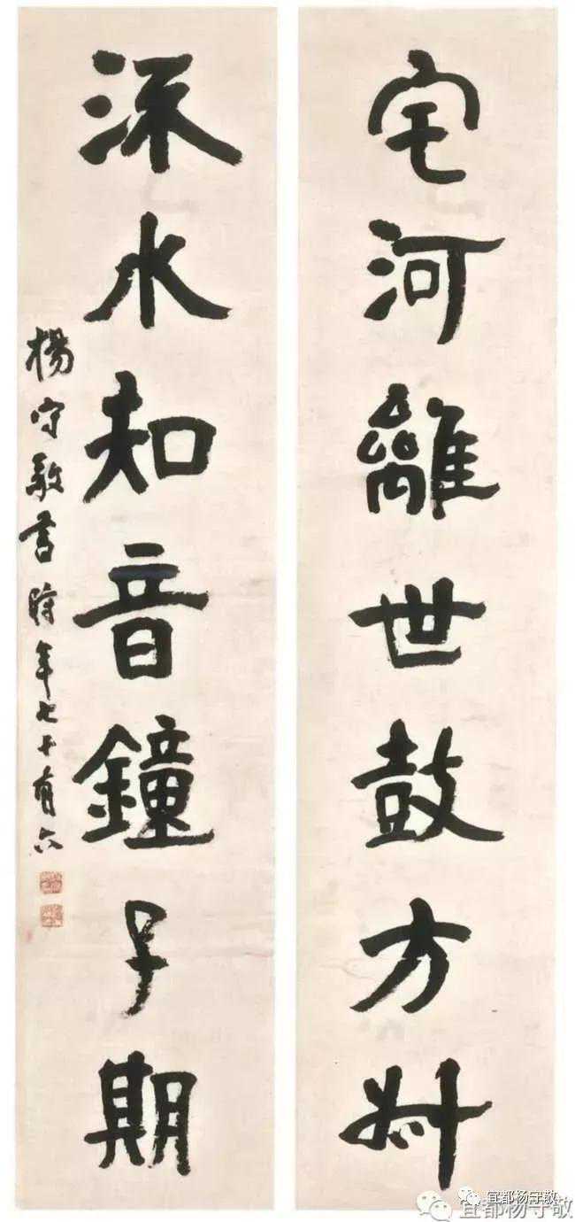 释文:宅河离世鼓方叔,流水知音钟子期。杨守敬书时年七十有六。钤“宜都杨守敬印”、“邻苏老人”白朱二。