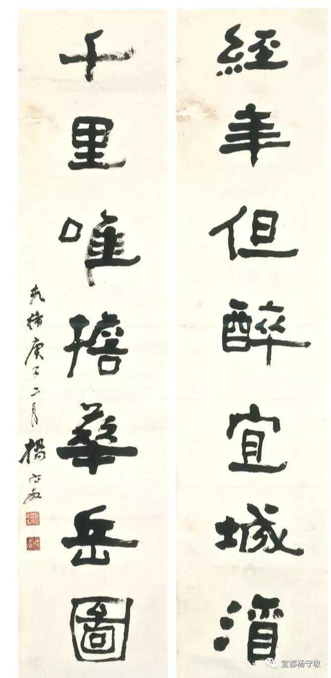释文:经年但醉宜城酒,千里唯担华岳图。光绪庚子二月杨守敬。钤“宜都杨守敬印”、“惺吾”白文二。