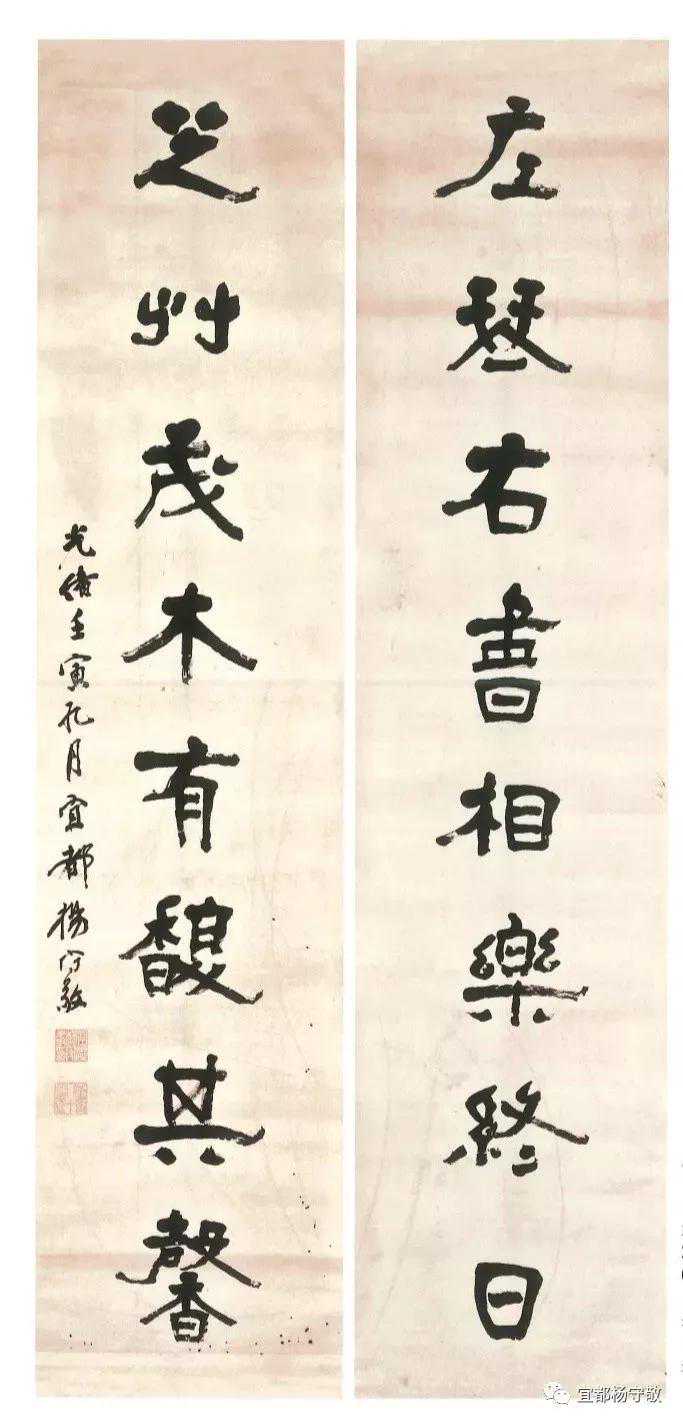 释文:左琴右书相乐终日,芝草茂木有馥其馨。光绪壬寅九月宜都杨守敬。钤“宜都杨守敬印”星吾六十以后作”白朱二。