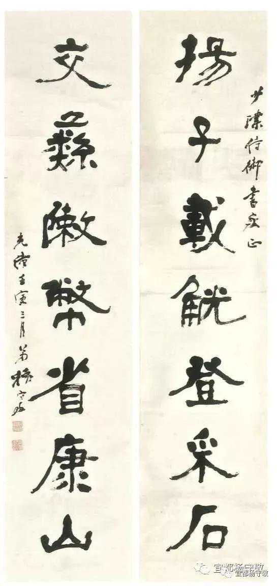 释文:扬子载觥登采石,交彝傲币省康山。少璞侍御书家正。光绪壬寅三月弟杨守敬。钤“宜都杨守敬印”、