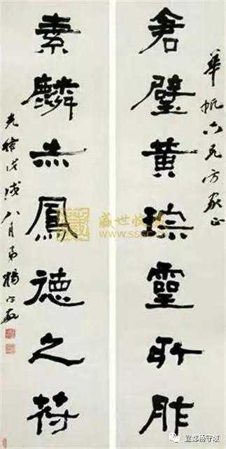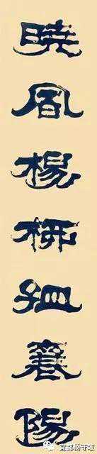 他的隶书有整齐、匀称、均衡等一般特点,又有他独到的创新。其收笔由粗到细,由实到枯,笔势沉稳,墨色浓涩,有浇铸之感。横划起伏波动,波折大胆放纵,显得苍拙而飘逸,庄重而活泼。有的是端朴若古佛之容,大多则是朴厚古茂,奇姿百出。