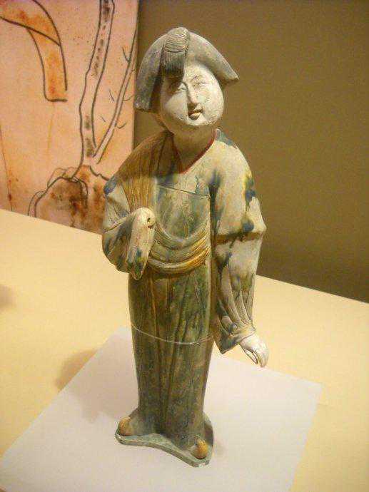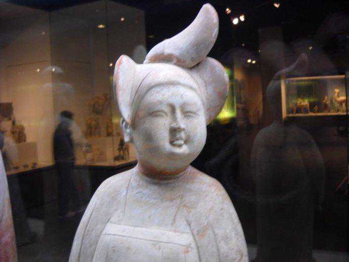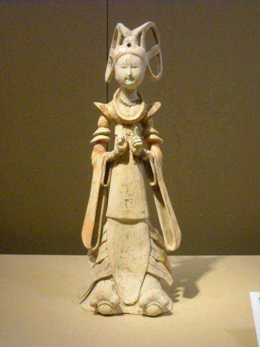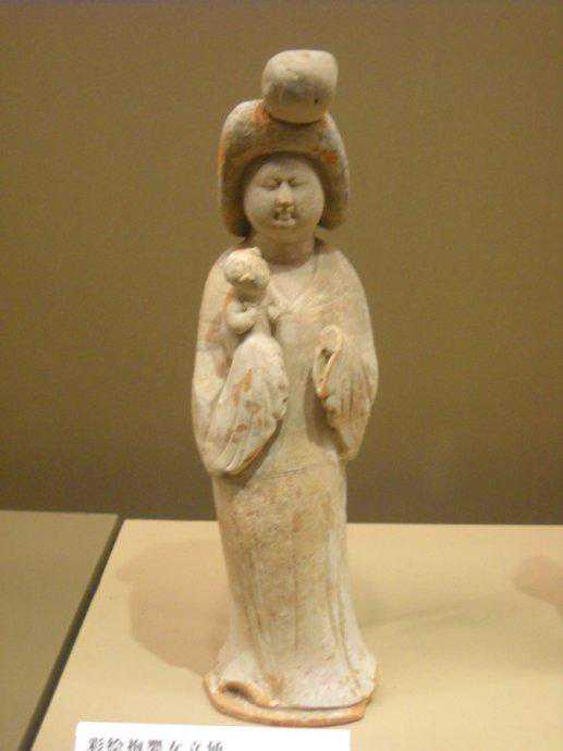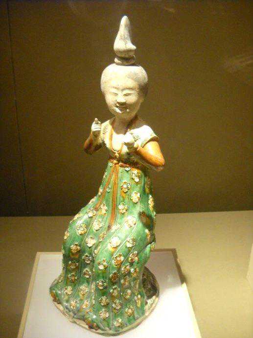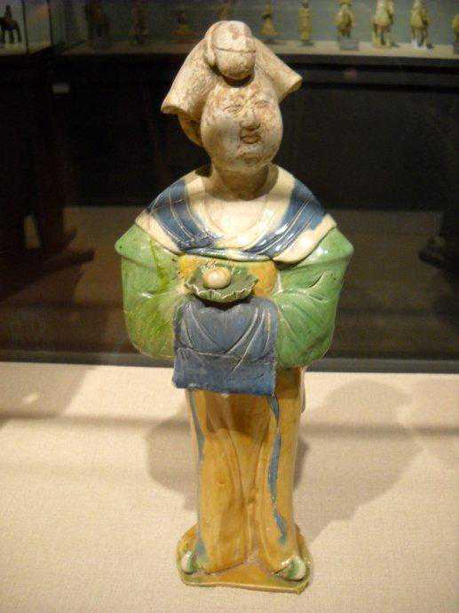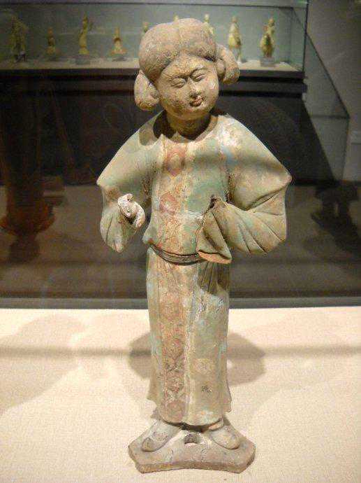 博文中展示的是唐代时期的“彩绘三彩釉女子陶俑”。唐朝妇女爱美,特别注重发式新奇与面部修饰。这一时期妇女的发式主要有半翻髻、双环望仙髻、囚髻、抛家髻、惊鹄髻、螺髻、百合髻、圆鬟髻等。发式之上插饰各种珠翠花钗、步摇、梳子之类。为追求新奇之美,唐代妇女常创造出新的发式,有的高出面部两倍以上,杨贵妃为标新立异,竟以假髻为饰。