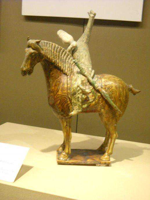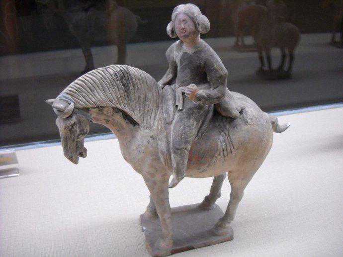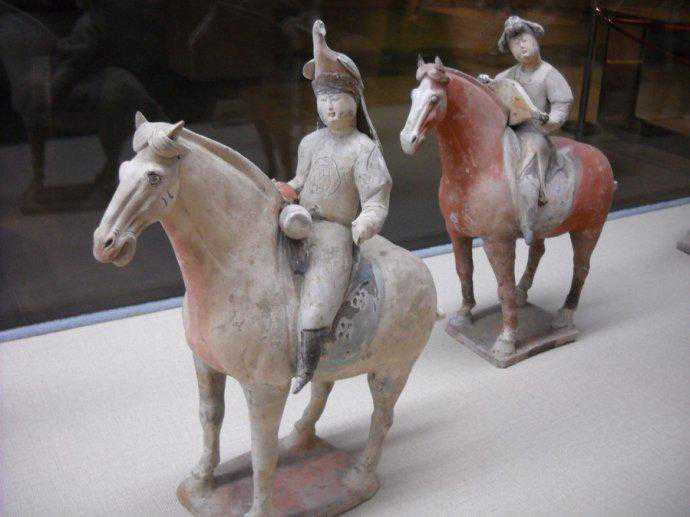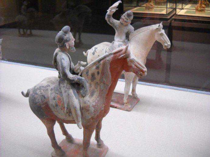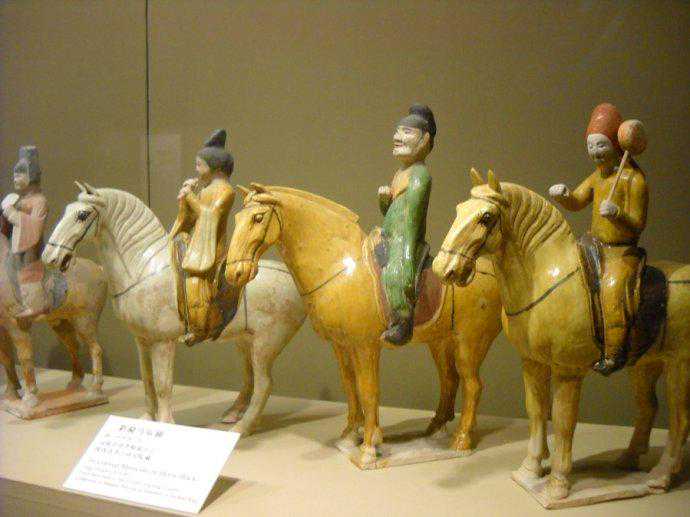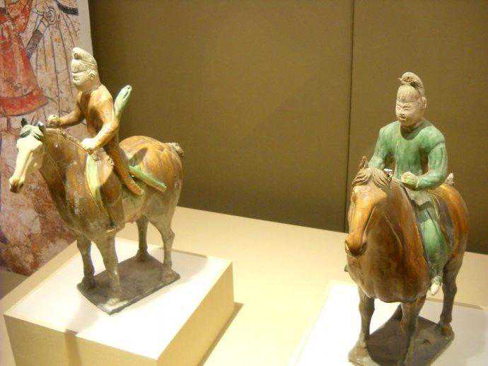 博文中展示的是唐代时期的“彩绘三彩釉骑马陶俑”。陶俑有:骑马奏乐陶俑、骑马打马球陶俑、骑马胡人陶俑、骑马狩猎陶俑、骑马武士陶俑、骑马戴帽女子陶俑。