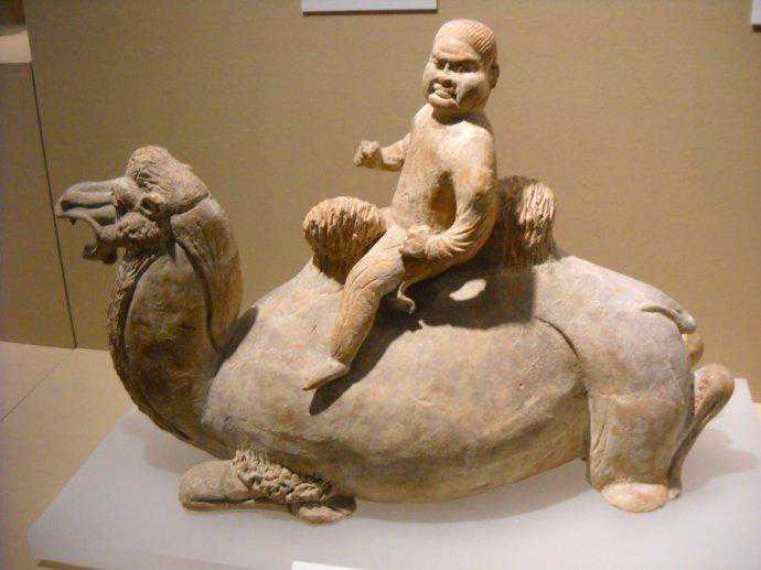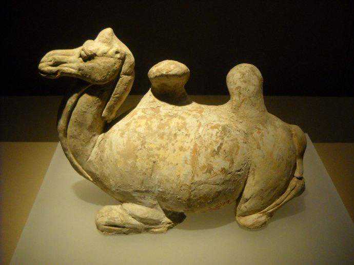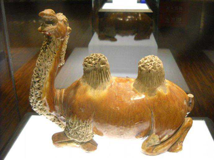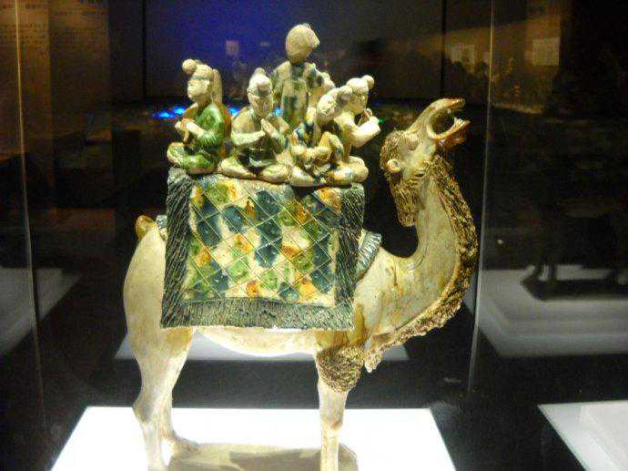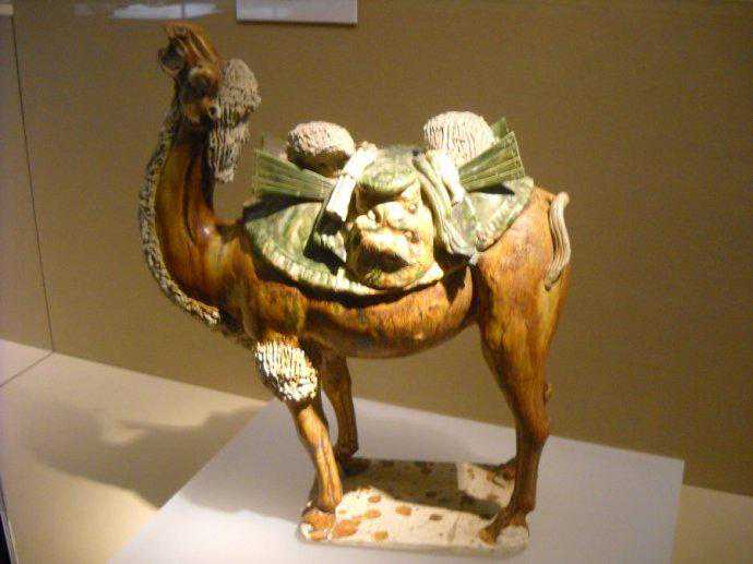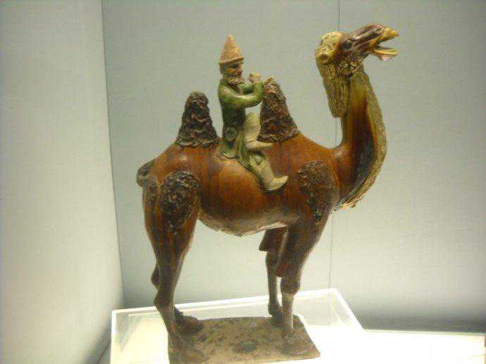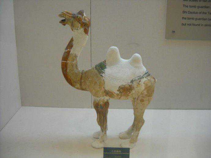 博文中展示的是唐代时期的“彩绘三彩釉陶骆驼及牵骆驼俑”。唐代對駱駝俑人的形塑,成就亦十分出色。駱駝早在南北朝時期已出現於隨葬明器中,到了隋唐,駱駝成為絲綢之路和兩京聯絡時最常見的交通工具,單峰、雙峰、或卧或立,有將起立前行狀的,也有負行李正待起程的,有邁步前行的。有張嘴嘶鳴的,有载奏乐俑的。充分反映了巧工良匠敏銳的觀察力和細密的工藝技術。