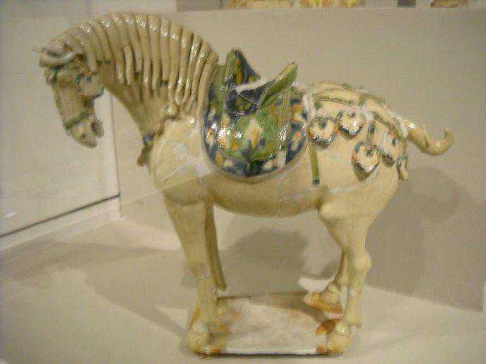 彩绘三彩釉陶马是唐代时期最令人喜爱的,造型均头小颈长,膘肥体壮,骨肉健美,眼睛炯炯有神,富于艺术的概括力。三彩釉陶马以白色三彩和黑色三彩最为名贵,以黄、绿、褐三彩为主的原则上价值略低。