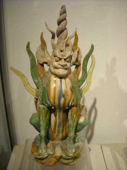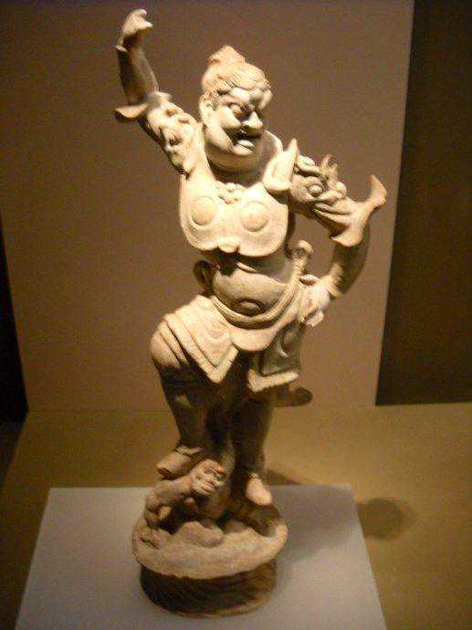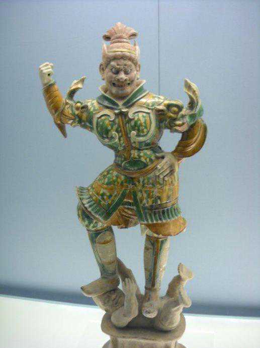 由于天王俑在墓中具有独特的作用,制作上也较精细,体量也较人物俑、动物俑大。彩绘三彩釉天王陶俑身穿铠甲,左手杈腰,右手高举,足下踏一跪着小鬼,它体现了主人希望阴间太平,不受鬼神侵扰的心愿。
