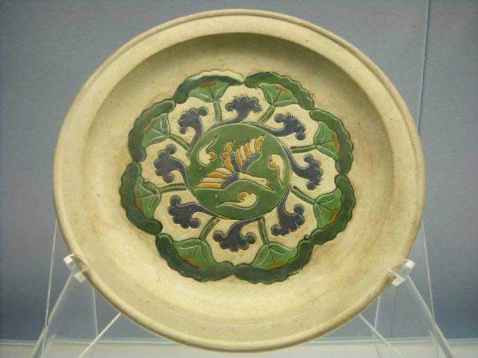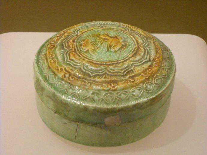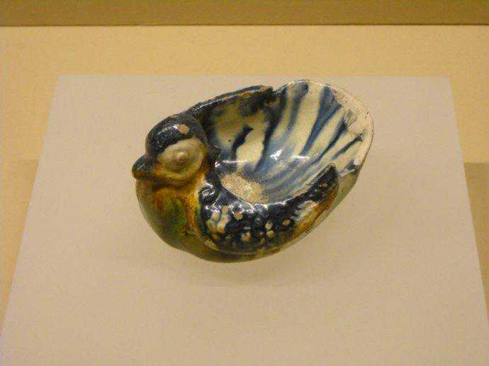 博文中展示的是唐代时期的“三彩釉陶器”。唐代三彩釉陶器是一种低温釉陶器,在色釉中加入不同的金属氧化物,经过焙烧,便形成浅黄、赭黄、浅绿、深绿、天蓝、褐红、茄紫等多种色彩,但多以黄、褐、绿三色为主。它主要是陶坯上涂上的彩釉,在烘制过程中发生化学变化,色釉浓淡变化、互相浸润、斑驳淋漓、色彩自然协调,花纹流畅,是一种具有中国独特风格的传统工艺品。唐代三彩釉陶器在色彩的相互辉映中,显出堂皇富丽的艺术魅力。唐代三彩釉陶器用于随葬,做为明器,因为它的胎质松脆,防水性能差,实用性远不如当时已经出现的青瓷和白瓷。