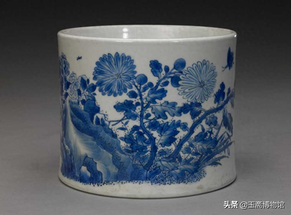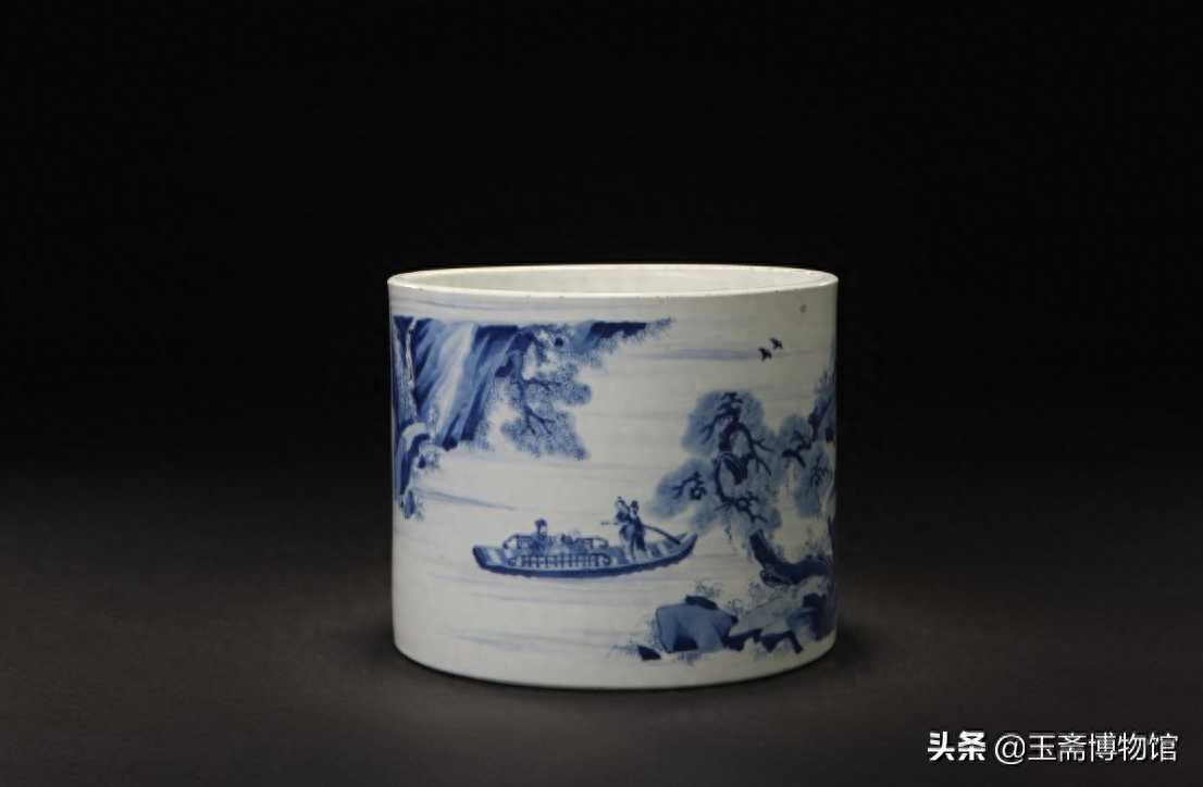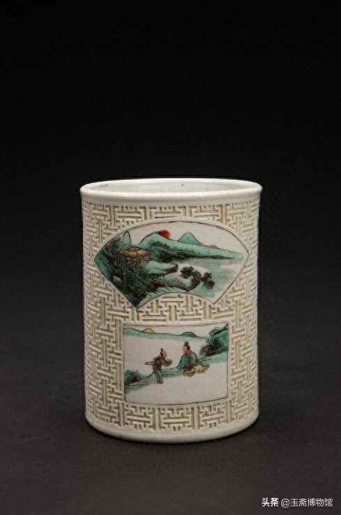 清康熙五彩雕万字锦地开光山水人物图笔筒