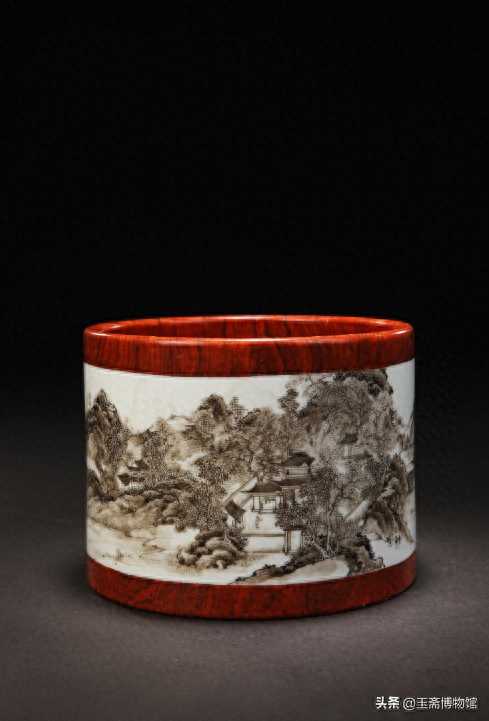 清乾隆陶成居士款仿官釉墨彩笔筒