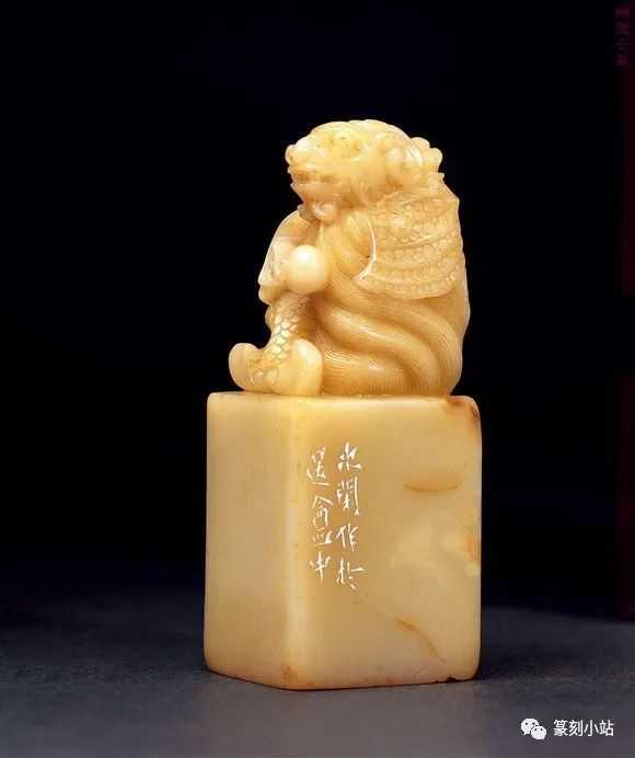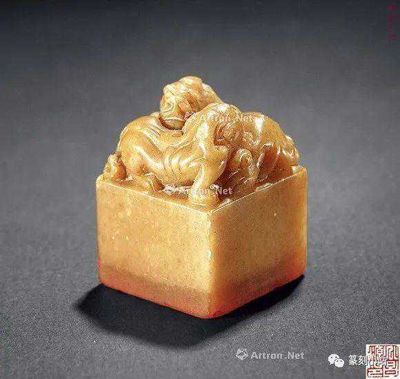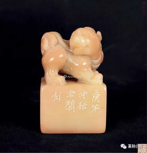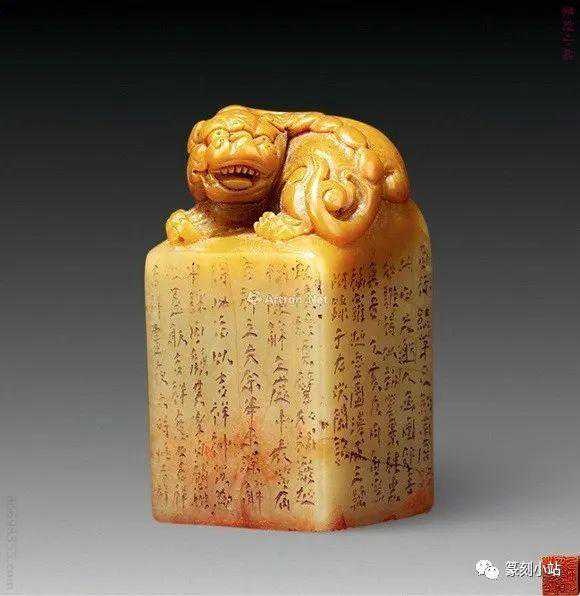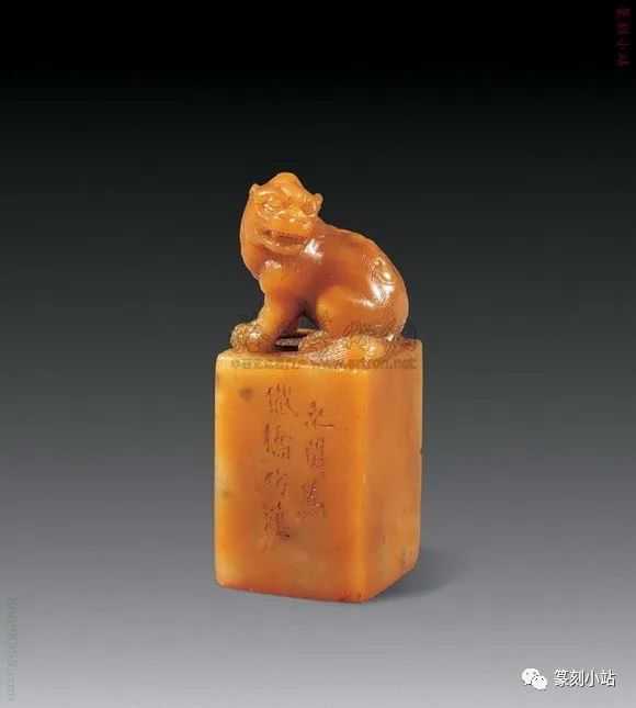 0032赵之琛刻芙蓉石瑞兽钮方章印文:最忆是杭州边款:次闲作于退庵中。尺寸:3×3×8.2cm