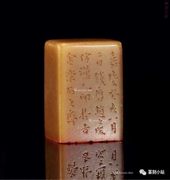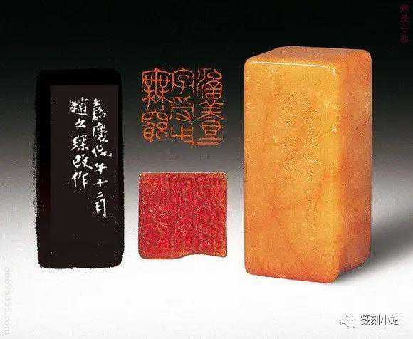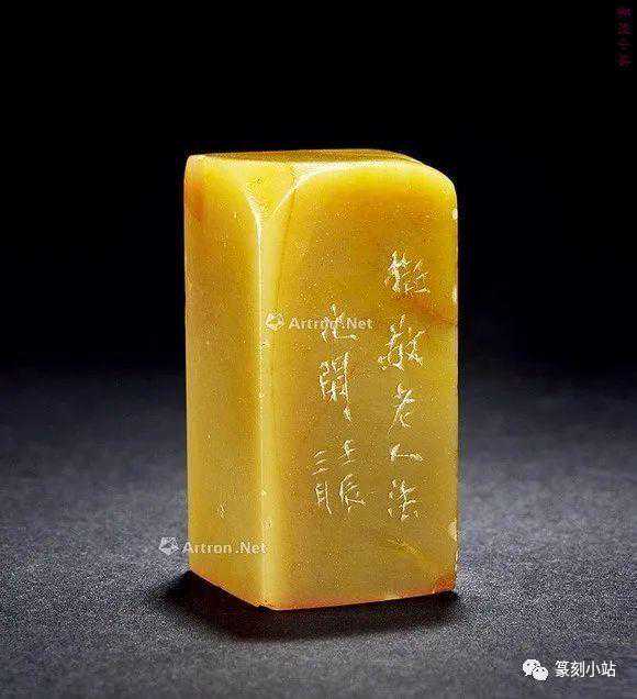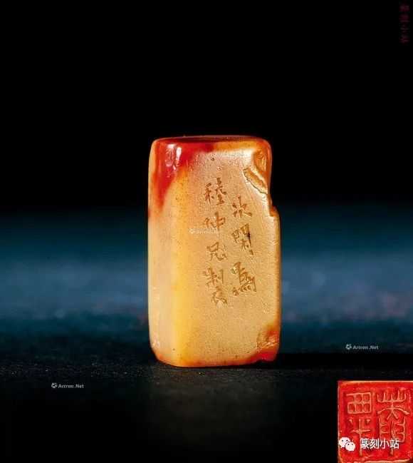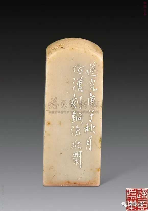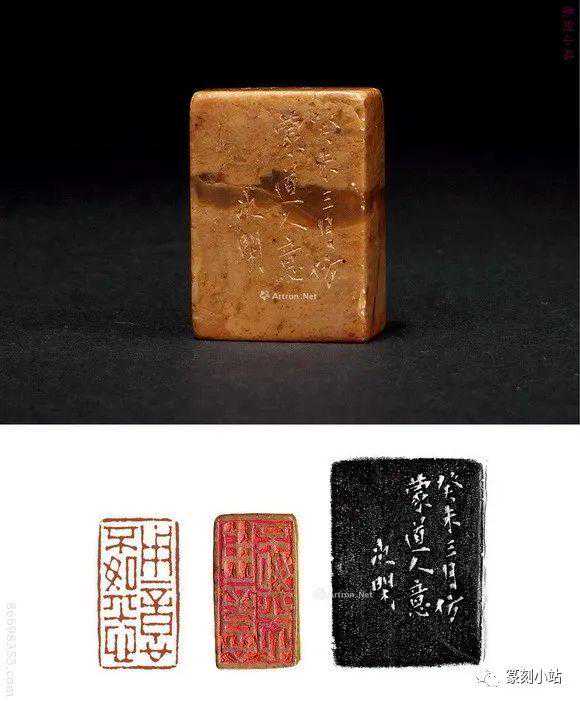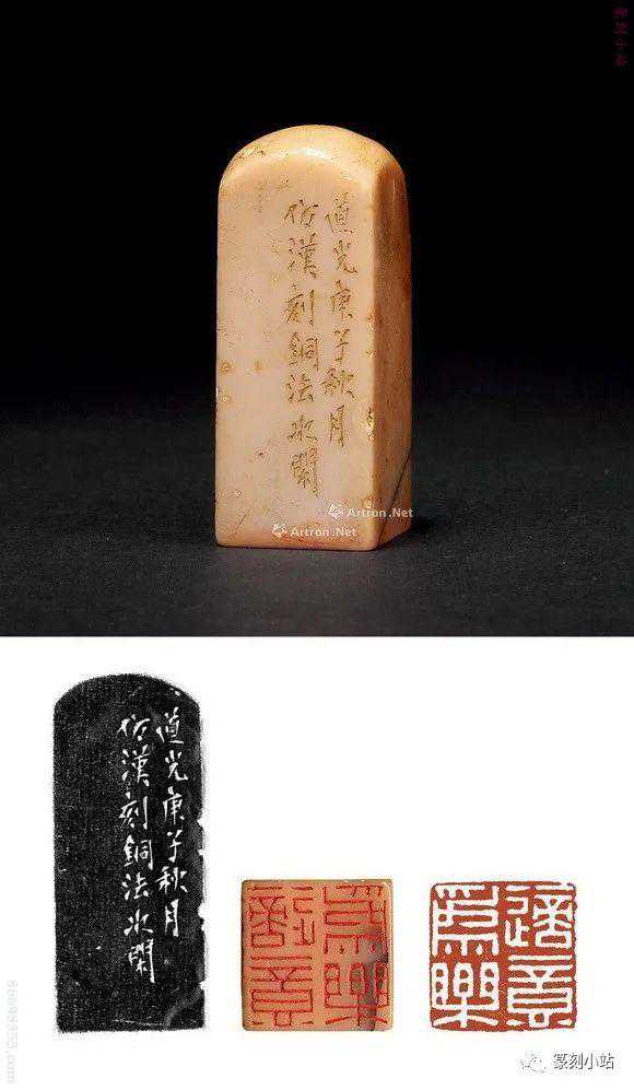 0785赵之琛刻青田印章印文:唯庚寅吾以降。边款:嘉庆癸亥八月二日,钱唐赵之琛仿汉人印于吉金乐石之斋。尺寸:2×2×3.1cm说明:日本小林斗庵藏赵之琛“唯庚寅吾以降”朱文印,见版于《中国篆刻丛刊》第十七卷,篆法章法与上拍此方如出一辙,边款亦相同,孰真孰赝,识者自知