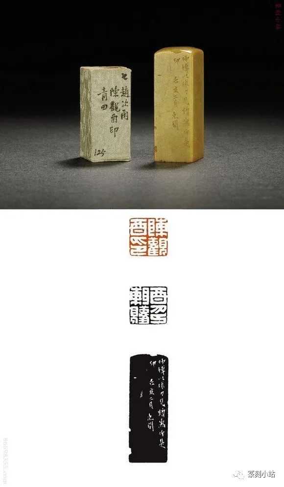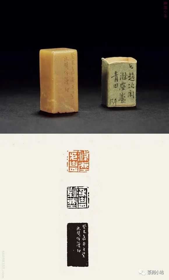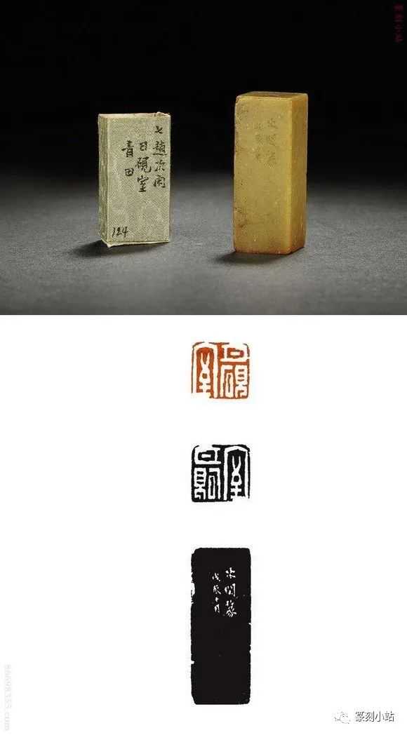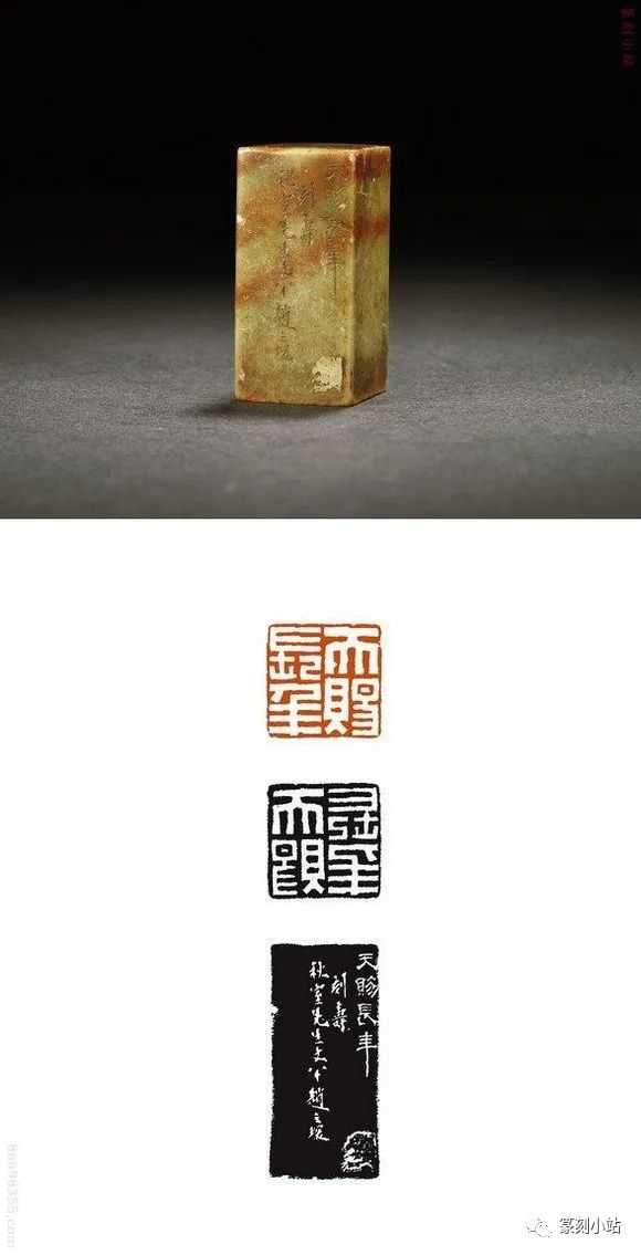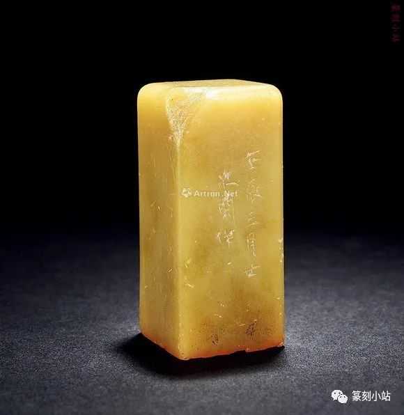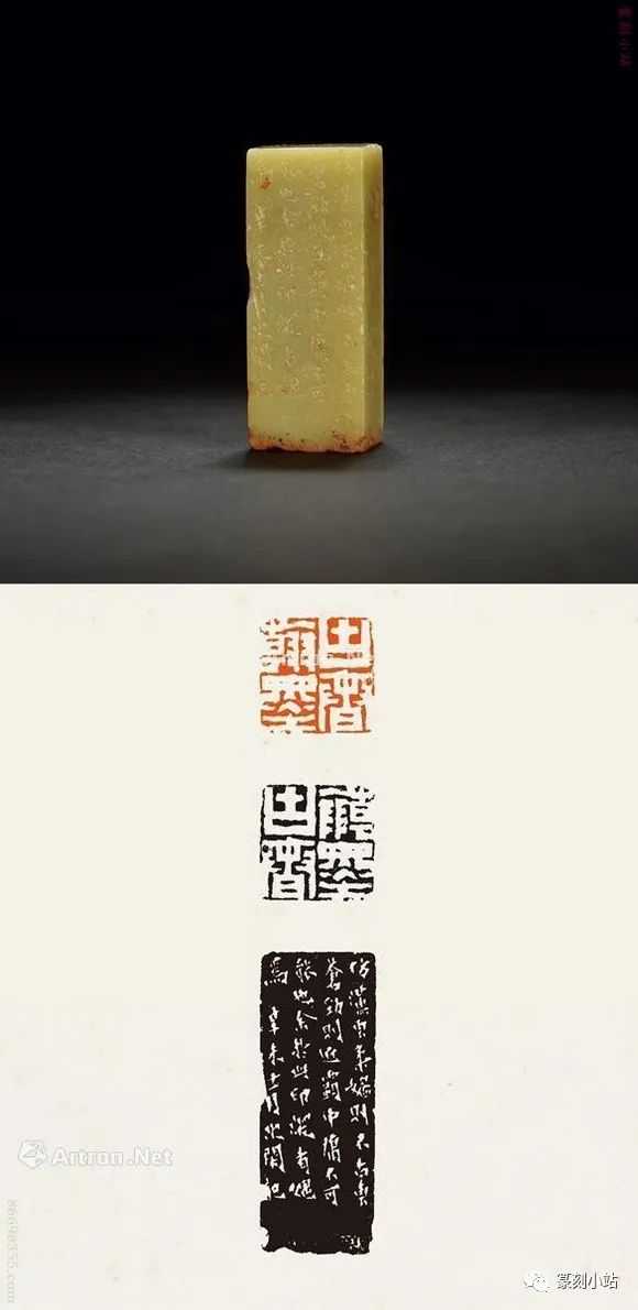 0785赵之琛刻青田印章印文:唯庚寅吾以降。边款:嘉庆癸亥八月二日,钱唐赵之琛仿汉人印于吉金乐石之斋。尺寸:2×2×3.1cm说明:日本小林斗庵藏赵之琛“唯庚寅吾以降”朱文印,见版于《中国篆刻丛刊》第十七卷,篆法章法与上拍此方如出一辙,边款亦相同,孰真孰赝,识者自知