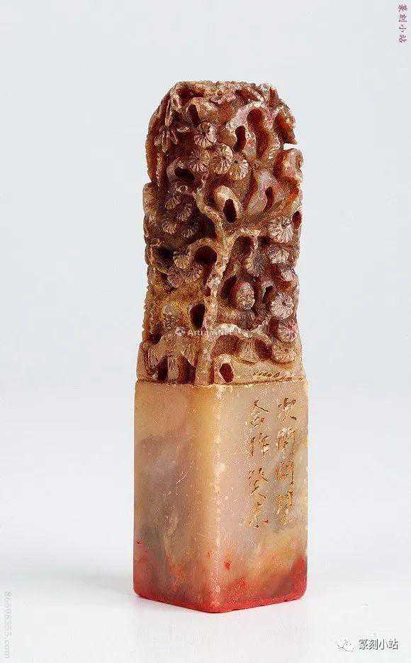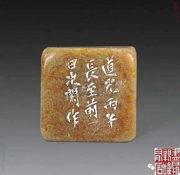 07311829年作清赵之琛刻寿山石人物钮闲章创作年代:1829年作清印文:留我花间住边款:己丑四月,次闲。观款:再百九十年子建获观,丁酉。尺寸:2.7×2×4.4cm说明:“留我花间住”朱文闲章,刀痕略显,方圆变化巧妙,细查之,气格在巧拙之间,线条粗细即为用心,粗一分则木强,细一分则纤巧,恰到好处,方正而有清丽之气。跋者简介:吴子建(1947~),名建,斋名长屋、从因楼,祖籍福建闽侯,生于上海。童年时,吴湖帆先生导之亲笔研,问业于张伯驹、叶恭卓、王世襄、容庚、顾廷龙、沈尹默、潘伯鹰、谢稚柳、陈佩秋、钱廋铁、来楚生、方介堪、方去疾、陈巨来等。1971~1990年间曾为谢稚柳制印一百余方。