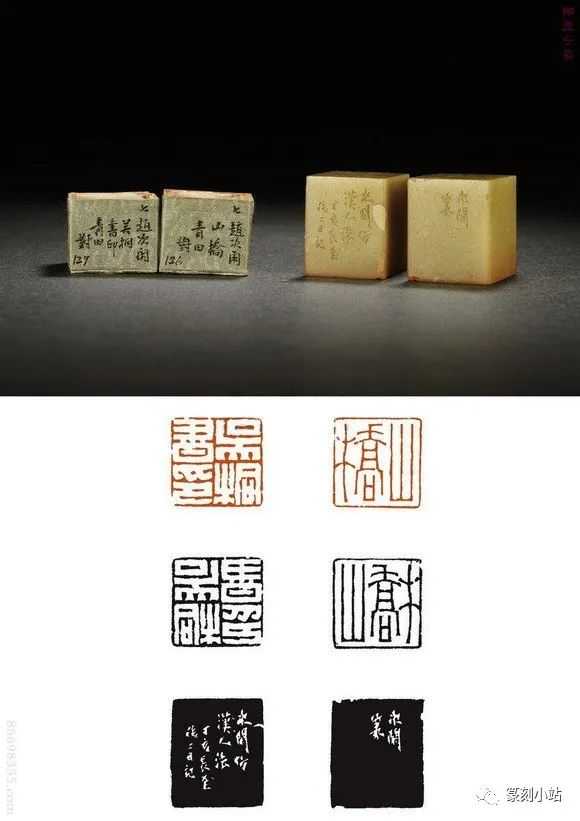 0721清·赵之琛青田石对章印文:1.吴桐书印2.山桥边款:1.次闲仿汉人法,丁亥长至后二日记。2.次闲篆。尺寸:2.8×2.8×3.3cm×2