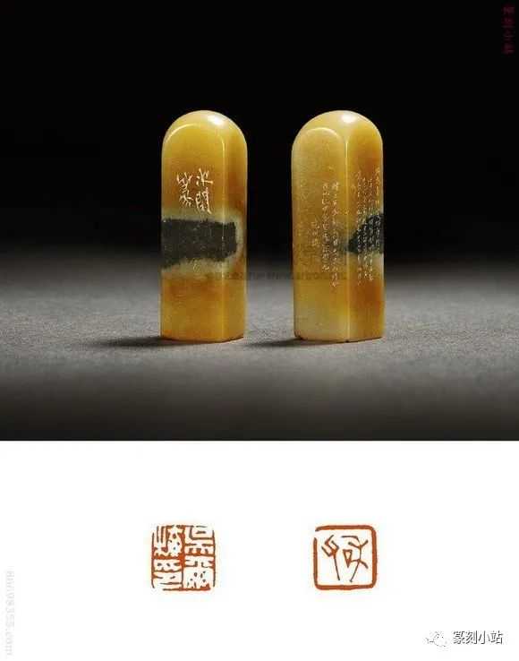 0760赵之琛刻寿山杜陵石对章印文:1.吴尔梅印2.和父边款:1.次闲仿汉。2.次闲篆。尺寸:1.9×1.9×4.6cm×2