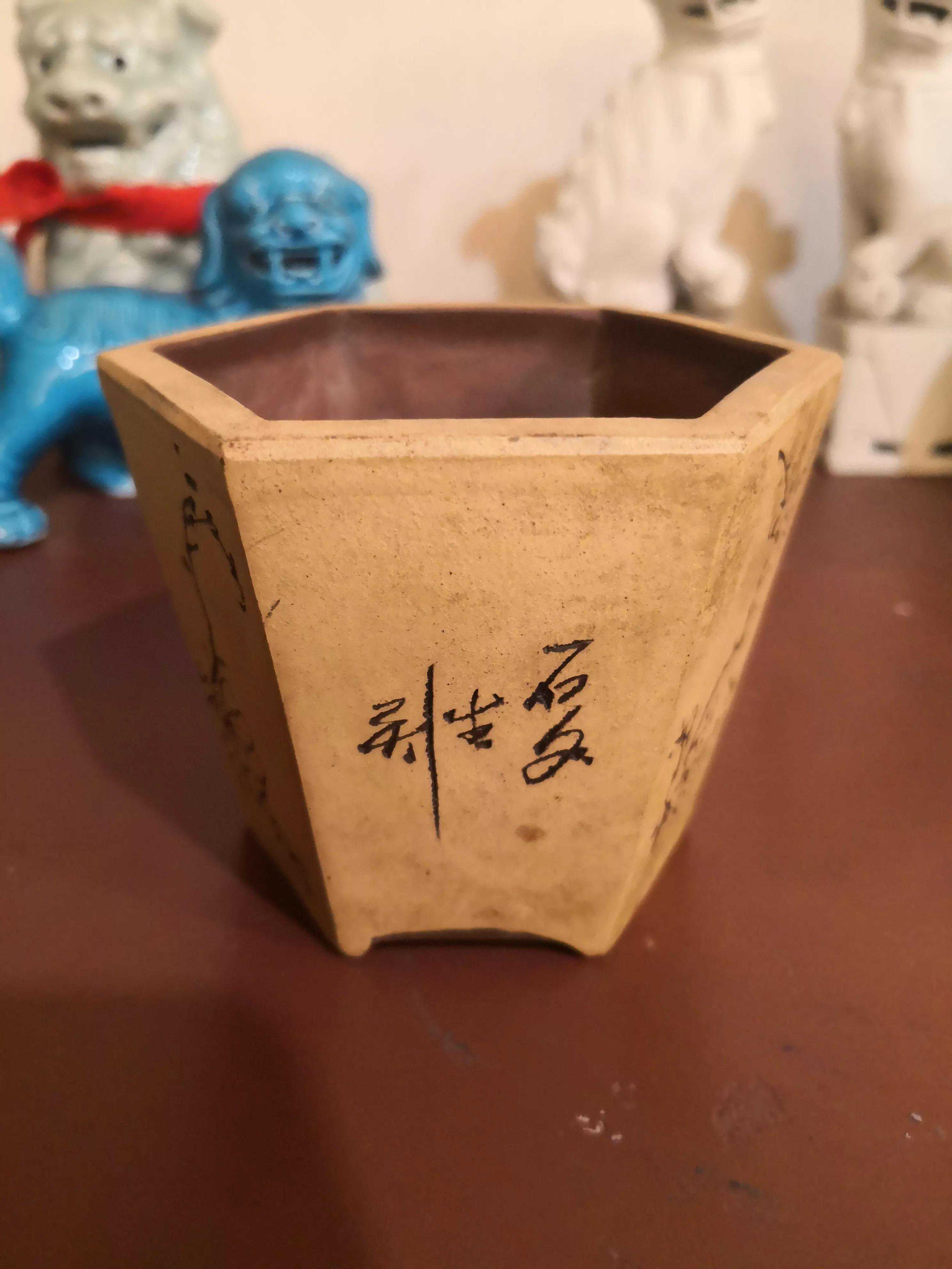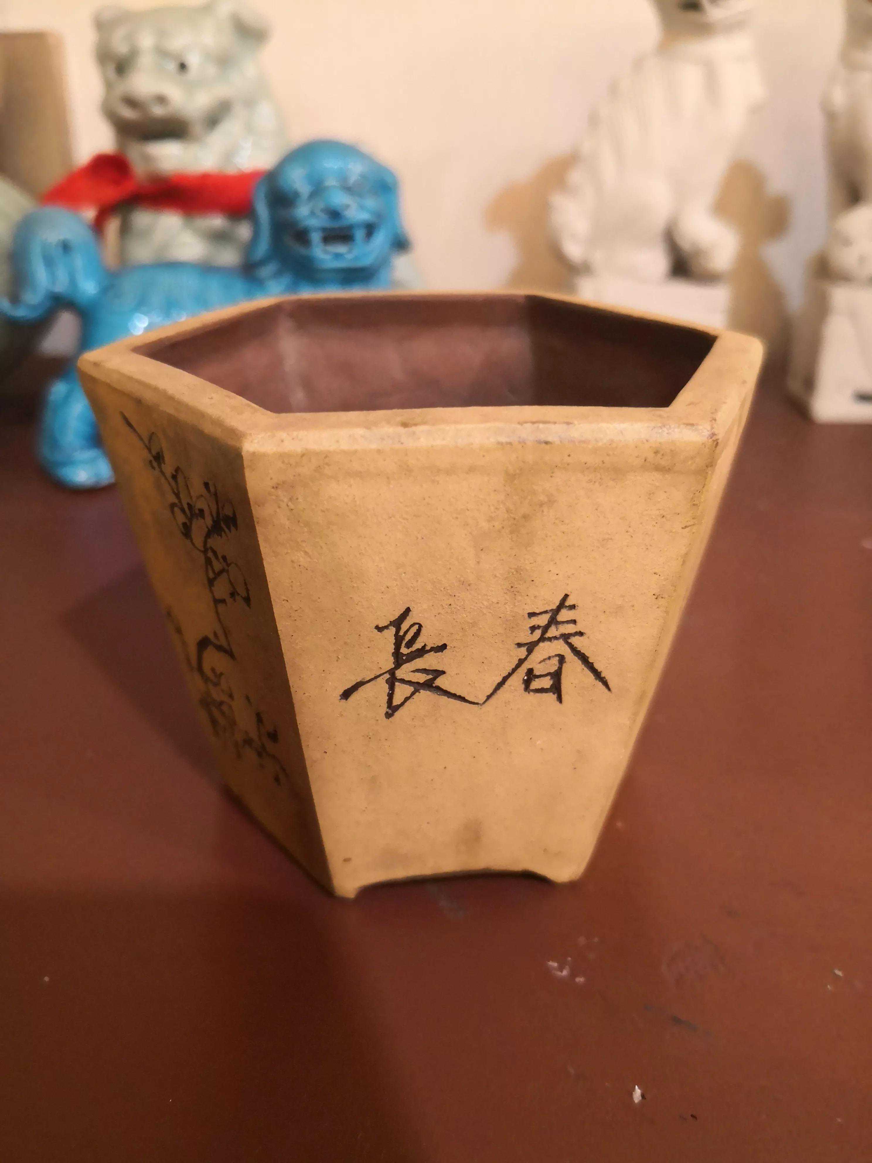 六十年代六角掸浆菖蒲花盆。三面绘画,三面诗文,石如生刻。