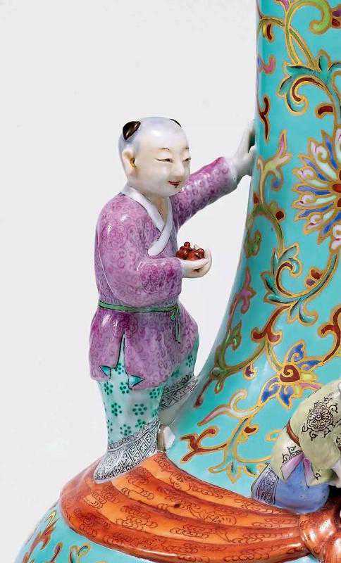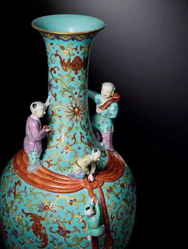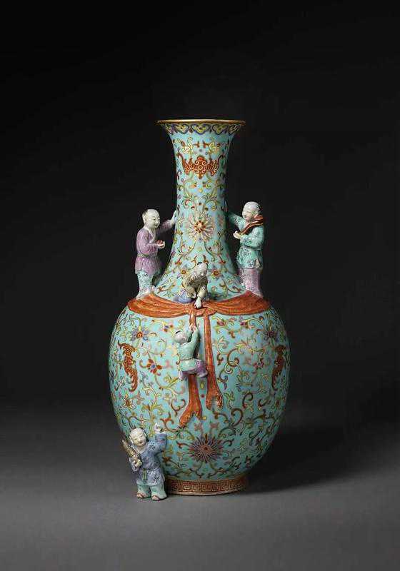 包袱瓶,又叫布袋瓶,始烧于清朝康熙年间,其器形一般是在瓶身上饰一凸雕的包袱巾或者束带。"包袱"与"包福"谐音,寓意幸福吉祥。是宫廷皇家常见的器型。此瓶式为包袱,松石绿为地,缠枝西番莲为清代赏瓶最常用的纹饰。五个儿童,寓意多子。若命名为清乾隆松石绿地粉彩五福瓶,或许更为恰当。本器五童子或手捧如意,或手持寿桃,或手拿竹笙,或攀爬嬉戏,描绘了一幅生动的五福临门图。人物表现细腻生动,布局巧妙,工艺精湛,实为乾隆朝同类题材中精品。