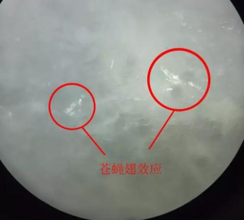 现代翠性指翡翠表层的硬玉颗粒晶面、解理面在光照下出现一个个亮白色反光小面的现象,行业中称为“苍蝇翅”。