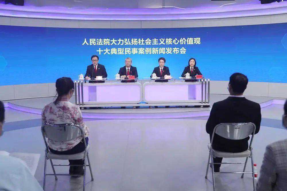 5月13日,最高人民法院举行新闻发布会,发布人民法院大力弘扬社会主义核心价值观十大典型民事案例。最高人民法院民一庭庭长郑学林、最高人民法院民一庭副庭长刘敏、最高人民法院民一庭审判员潘杰出席发布会并介绍相关情况。最高人民法院新闻发言人李广宇主持发布会。