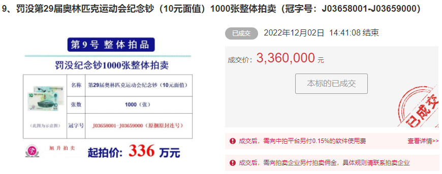 1万张奥运钞结果如何?在12月2日的罚没专场中,10捆奥运钞最多细分到了整刀。先拍整捆,流拍后再细分为10刀拍卖,10捆的总起拍价是3360万,折算单张是3360元起拍。