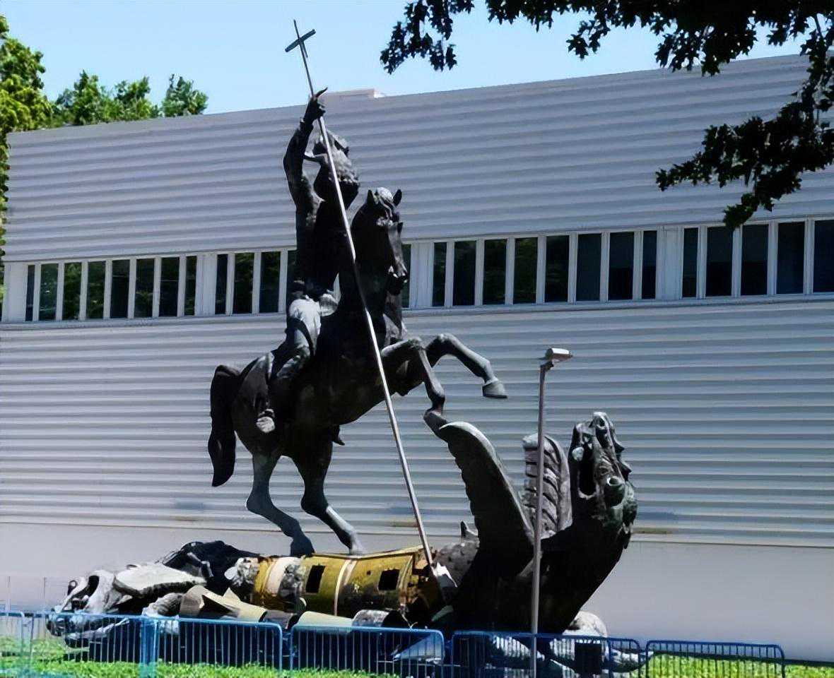 这是前苏联赠送的另外一件雕塑。作品直观来讲,表现的是中世纪圣乔治屠杀恶龙的情景。这个主题在西方文化中具有着很强的象征意义——即正义战胜邪恶。再结合赠送的时代背景(上世纪90年代),这件雕塑则是表现了人类降服邪恶战争的幽灵,并表达了前苏联当时大力裁军的巨大决心。这件作品最大的亮点在于地上的恶龙除去头部,其身体是由各种导弹的零部件组合而成,正是当代景观主题雕塑常用的表现手法。传统雕塑手法与工业化标准件通过嫁接,实现艺术主题的再生。
