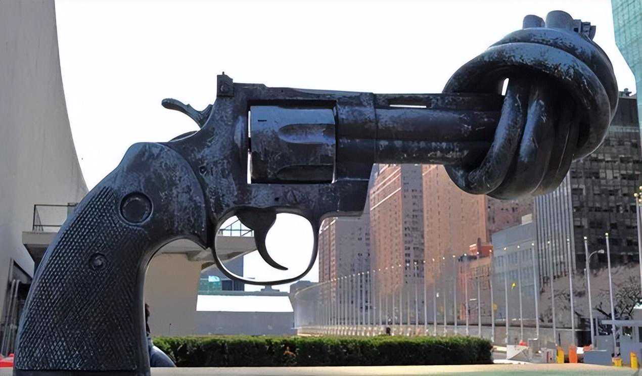 这支枪管打了结的手枪(KnottedGun)正是纽约联合国大厦外的标志性雕塑之一,近乎黑色的青铜雕塑象征着崇尚非暴力,力主和平方式。这是卢森堡政府1988年赠送的,设计者是来自瑞典的艺术家CarlFredrikReuterswärd,因为他的好友约翰·列侬(JohnLennon)死于枪杀而激起他的创作灵感,用此雕塑警醒世人结束暴力,崇尚和平。