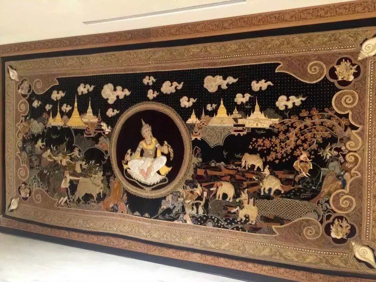 这是一副表现缅甸历史人文和民族风貌的装饰艺术品,无论是人物服饰,还是佛塔造型,都有着浓郁的缅甸风情。