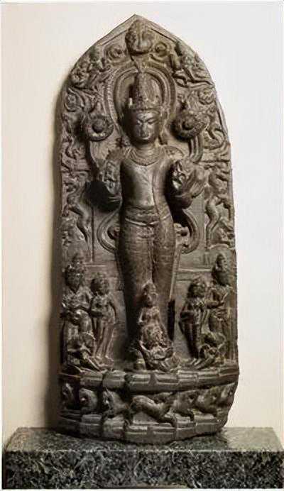 这是印度前总理莫迪拉·甘地赠送的印度十一世纪的佛造像,有着典型的波罗风格。作为进入密教时期的印度佛教,这时期的佛造像已经完全的本土化。这尊佛像双手持莲华,基座以马为座。佛像神格的可能性包括马鸣菩萨、宝生佛以及虚空藏菩萨。这三位均属密宗范围内的佛像,且以马为坐骑。