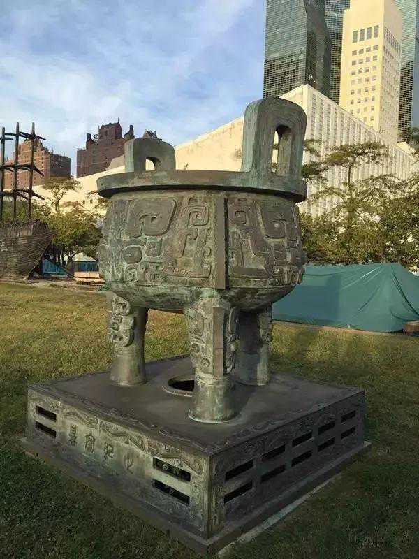 1995年10月,为纪念联合国成立50周年,中国向联合国纽约总部赠送了一座重约1.5吨的“世纪宝鼎”。这座鼎目前安放在联合国大楼北花园的草坪上,鼎座高0.5米,象征联合国成立50周年;鼎身高2.1米,象征21世纪;底座上饰56条夔龙,象征56个民族都是龙的传人。