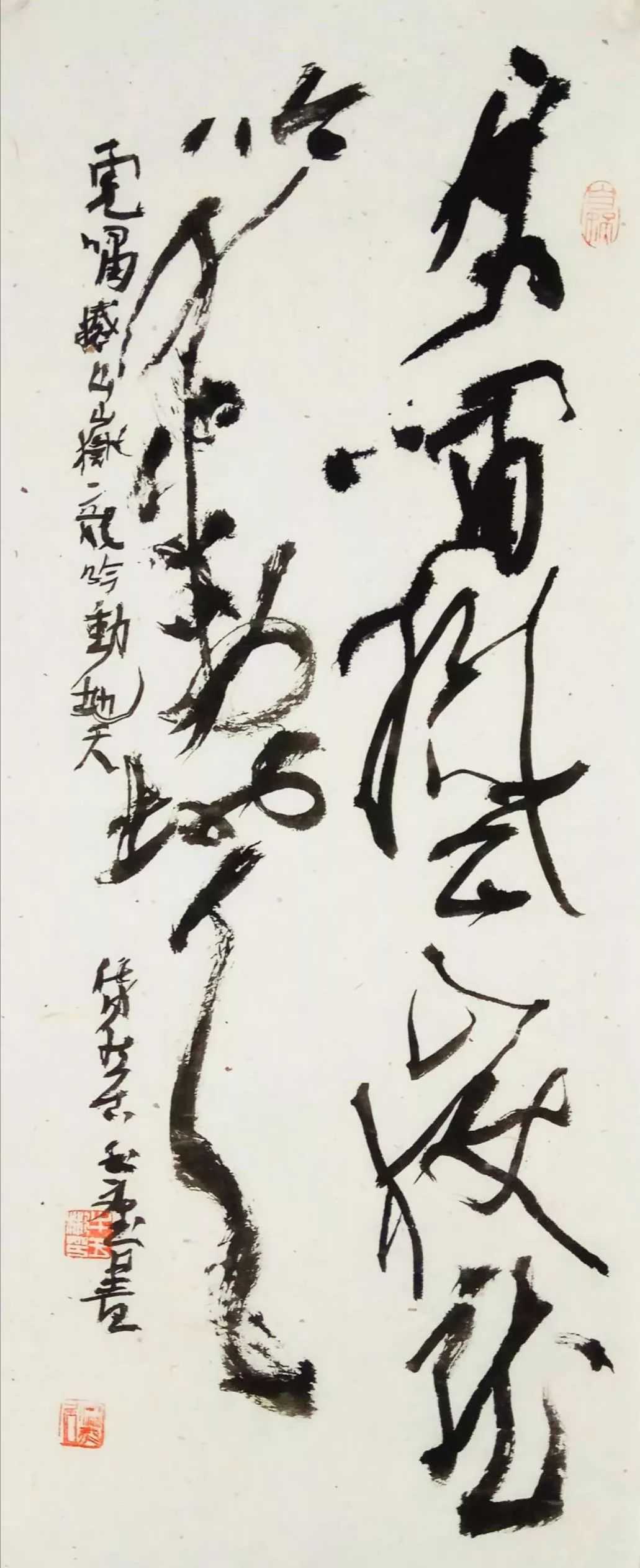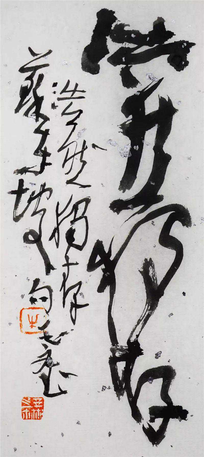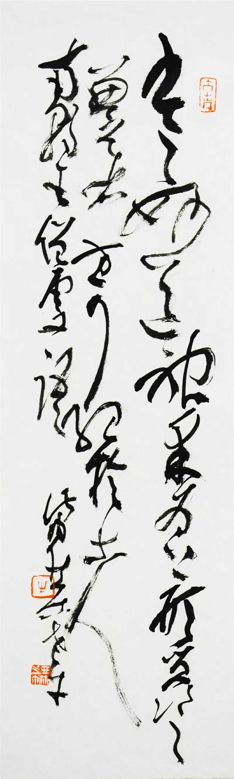 天分高的书家往往青睐草书,牛玉彬也是这样。他在二王行草方面打下扎实功底的基础上,专攻张旭、怀素的狂草,同时参临黄庭坚、王铎等,转益多师,积深培厚。数年下来,其草书已经初具规模,形成了自己的面貌。他的草书具有气息通畅,线条凝练,结体奇巧,富于变化的特点。气息的贯通畅达是草书的重要特征,对于狂草来说尤其如此。观其草书,气息通贯,一气呵成,如江河奔腾,一泻千里,具有排山倒海、摧枯拉朽的宏伟气势。所谓通畅者,不见得是字字相连,但即使是断笔,乃至字字独立,气息仍然可以畅达无滞。要做到这一点并非易事。除了熟练地掌握字法,更重要的是胸有全局,高屋建瓴。牛玉彬的草书充分展示了作者在这方面的过人能力。