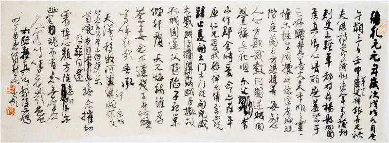 当然,气息的畅达还须建立在高质量的线条的基础上。草书没有高质量的线条是很难做到整体气息畅达的。我们看到,玉彬草书的线条刚劲而凝炼,顿挫有致,收放自如,有良好的质感和巨大的张力。他草书的用笔属于张旭系统,提按变化的幅度比较大,与怀素一分笔的纯中锋线条迥异其趣。一般说来,怀素的用笔较为易学,而张旭用笔学起来难度更大。牛玉彬选的恰恰是这样一条更具挑战性的草书之路。在其草书用笔中,有两点特别值得注意:一是他参用黄庭坚、王铎的草书,善于用点和顿挫峻折,努力在线条的流畅中增加厚重感和丰富的变化;一是他吸取章草用笔的特点,用“激石波”的笔势来调节用笔的节奏。这就使得他草书线条在流畅通贯中体现出清健浑厚的特质和行留得体的节奏。