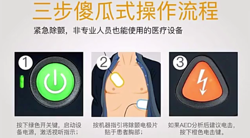 其实,心脏除颤仪是一部能够自动监测患者心律并施以电击使心脏恢复正常运作的医疗仪器。跟医院里专业医护人员使用的手动除颤器不同,AED是专门设计给一般群众使用的,仪器的操作非常简单,还会以语音方式给抢救者提供操作的注意事项,堪称“傻瓜级”。通常只需要开启电源、将贴片贴至患者身上,AED便会自动分析心律,判定是否需要电击,操作者只要依照机器的指示执行,直到专业医护人员到达。