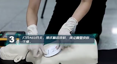 3、打开AED开关,擦拭胸部皮肤,保证胸壁皮肤干燥。必要时可擦干皮肤和备皮刀去除毛发。