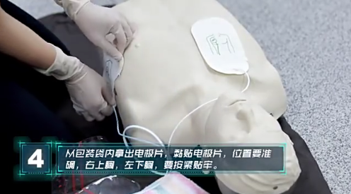 4、从包装袋内拿出电极片,去除电极膜上的保护膜,在患者胸部紧密地贴上电极。通常而言,两块电极板分别贴在右上胸部和左下胸乳头外侧,具体位置可以参考AED机壳上的图样或电极板上的图片说明。