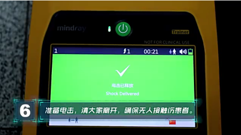 6、当AED分析结果有除颤指征时,不要与患者接触,同时告诉附近的其他任何人远离患者。确保无人接触患者后,根据提示由操作者按下“放电”键除颤。